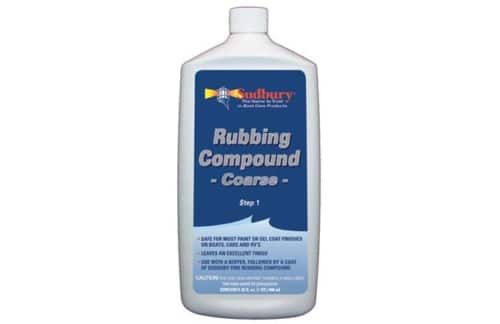 Rubbing Compound – Coarse, Step 1 – Provides fast cut and leaves an excellent finish without swirl marks. This liquid compound and finishing material is designed to remove 600/800 wet sanding scratches from gelcoat. Use this with a buffer, followed by a coat of Sudbury Fine Compound.
